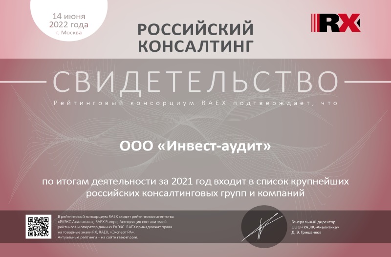 По данным рейтингового агентства "РАЭКС-Аналитика" компания "Инвест-аудит" по итогам деятельности за 2021 год занимает 41 место в списке крупнейших российских аудиторских организаций (субъектов аудиторской деятельности), а также крупнейших российских консалтинговых групп и компаний.